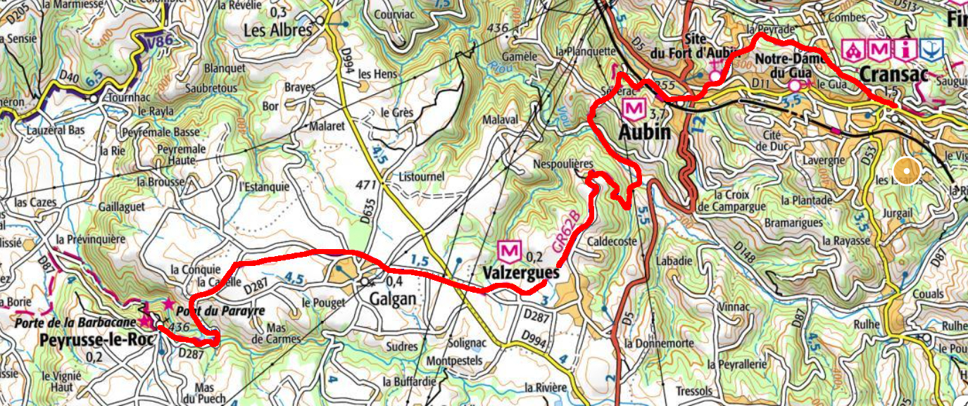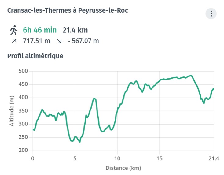 Après la traversée de Noailhac et un parcours de 5 kms sur crête, vous arriverez à l'intersection du GR65 et du GR62B,il vous faudra suivre ce dernier en descente direction Cransac via le "Puy de Volf" et le village de Firmi. A Cransac-les-Thermes, nouvelle ville "halte Compostelle", vous pourrez profiter des thermes si vous le souhaitez.