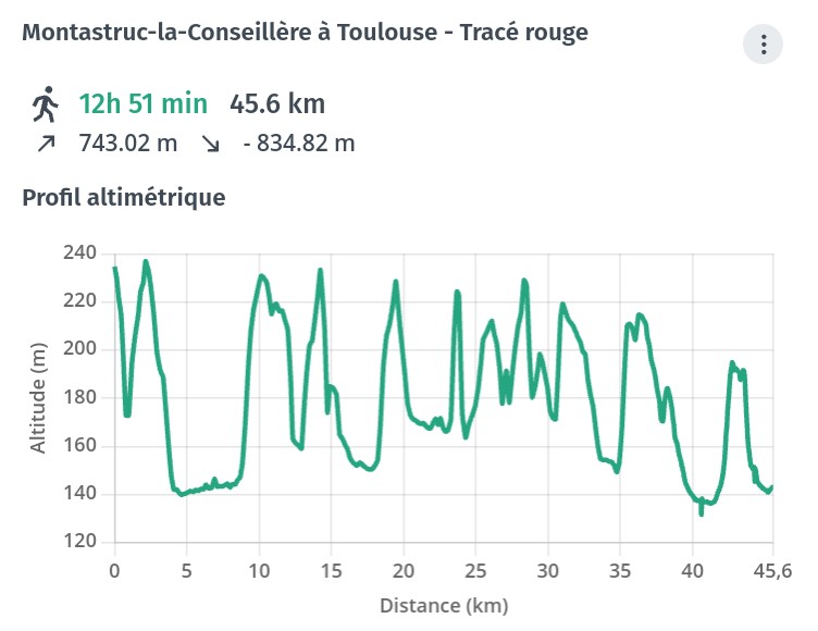 Le tracé en bleu est l'ancien tracé officiel que nous préconisons même si le balisage a disparu. Le tracé en rouge est le nouveau balisage officiel ajoutant quasiment une étape supplémentaire.