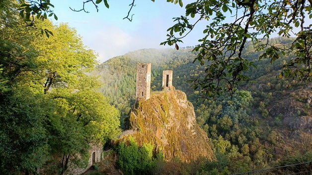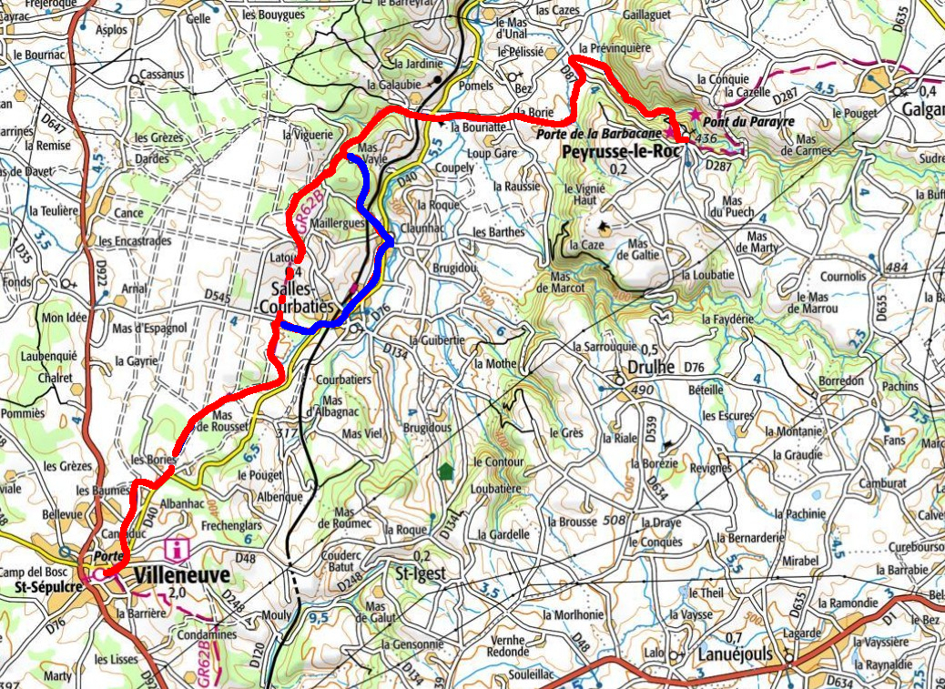 On ne se lasse pas de la perspective du Roc del Thaluc quand le soleil levant du petit matin amplifie par le jeu d’ombres et de lumières l’impression de vertige. Peyrusse 3500 habitants … oui mais c’était au XIII ème siècle, on comprend que le plus gros chef lieu de baillage du Rouergue ait conservé des vestiges qui méritent d’être visités. L’association ‘’le Bastidou’’ a pendant 40 années de chantier contribué à la restauration des 10 ha de vestiges. Les monuments sont sur le GR et le temps de parcours de l’étape a tenu compte des temps d’arrêt à l’église ruinée de Notre-Dame de Laval, la synagogue, …et l’hôpital des Anglais qui hébergeait les pèlerins du chemin de Saint-Jacques.