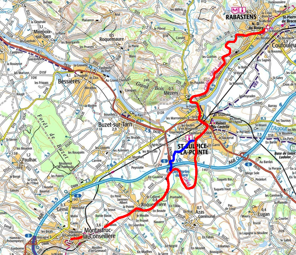 Les tracés en bleu sont des variantes qui permertent d'économiser quelques kilomètres et du dénivelé en évitant la montée à la chapelle de Montaigut