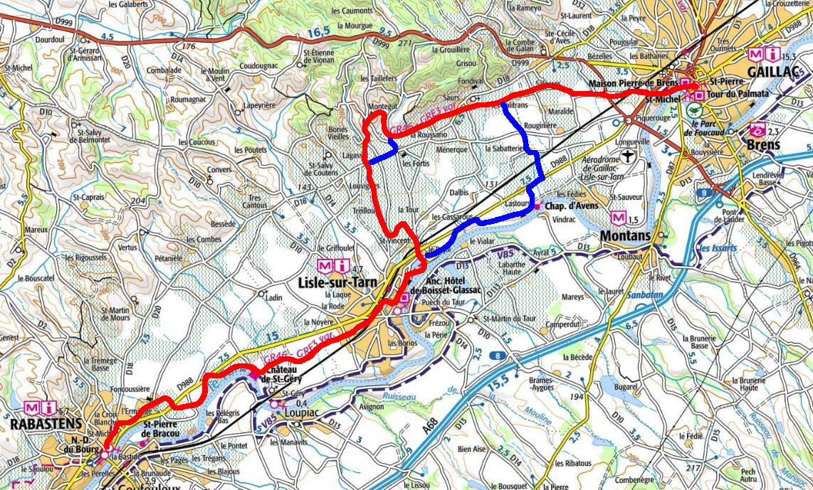 Les tracés en bleu sont des variantes qui permertent d'économiser quelques kilomètres et du dénivelé en évitant la montée à la chapelle de Montaigut